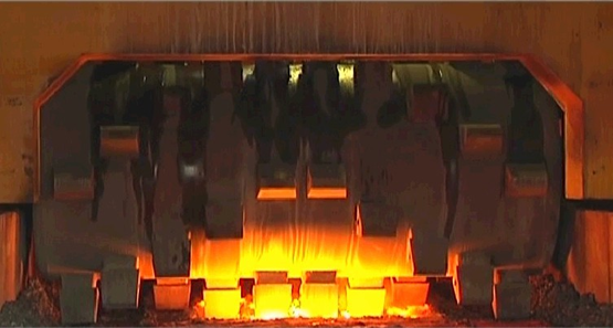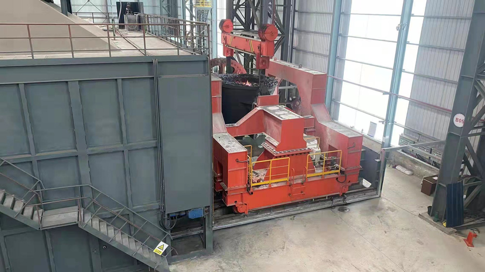 傾翻機構(gòu)將約1600℃熔融鋼渣送入熱破碎間。